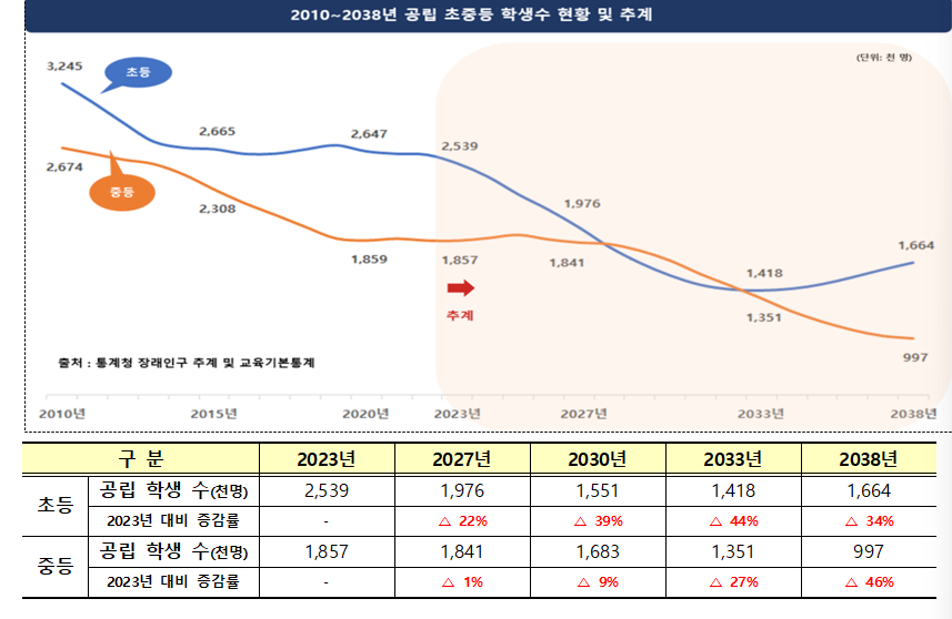 ① 2021년 통계청 장래인구추계에 따르면 공립 초‧중등 학생 수는 2023년 대비 2027년까지 약 58만 명(약 13%)이 감소하고, 이후 감소 폭이 확대되어 2038년까지 초등 약 88만 명(약 34%), 중등 약 86만 명(약 46%)이 감소할 것으로 예상되며, 이번 교원수급계획은 학령인구 감소 충격을 최소화하기 위해 이러한 변동 추이를 분산하여 반영하였다.