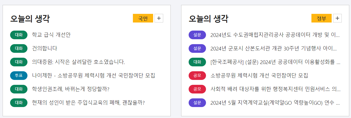 - 다양한 참여 방법: 생각쓰기, 투표, 설문조사 등 다양한 방법으로 참여할 수 있어 누구나 쉽게 의견을 남길 수 있습니다.