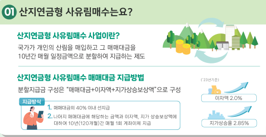 산림청은 개인이 소유한 산을 구매한 뒤, 매매대금을 10년간 연금 형태로 나누어 지급하는 '산지연금형 사유림 매수사업'을 운영하고 있다. 이는 산주들의 안정적인 노후생활을 보장하기 위한 제도로 마련되었습니다.