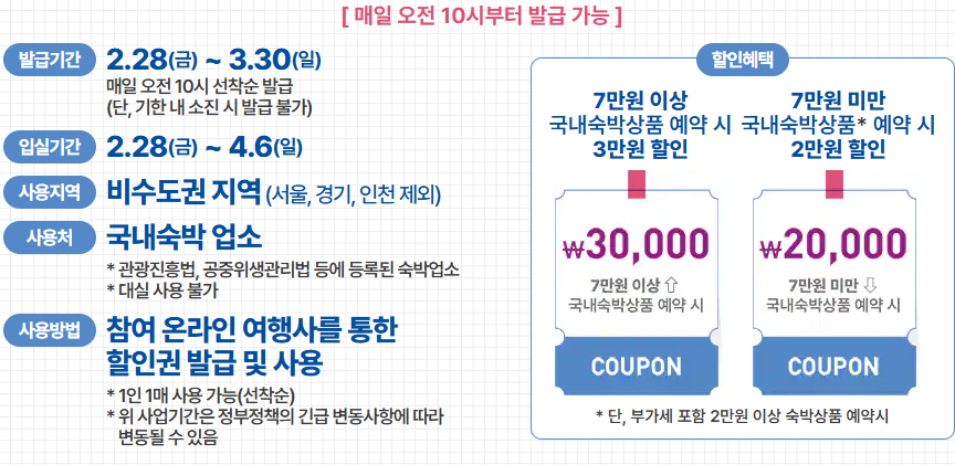 - 사용 기간: 3월 28일 ~ 4월 6일 (비수도권 숙박시설에서 사용 가능)
