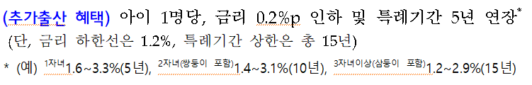 - 혜택: 아이 1명당 금리 0.2%포인트 인하 및 특례 기간 5년 연장, 단 금리 하한선은 1.2%, 특례 기간 상한은 총 15년