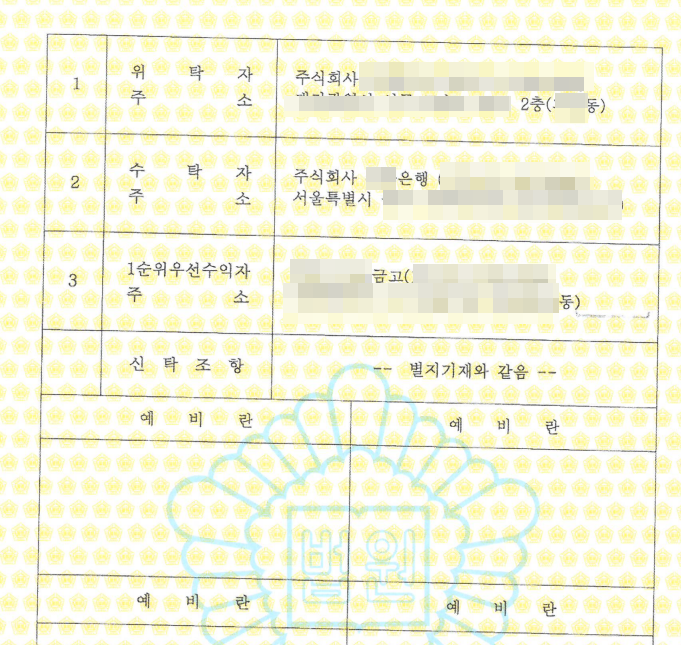 이 사례는 위탁자와 수탁자 외에 우선수익자도 기재 되어 있습니다. 우선수익자도 여러명일 수 있는데 여기 사례에서는 1순위 우선수익자만 있습니다.
