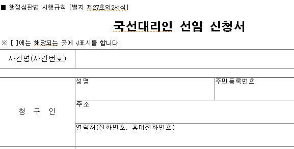 국선대리인 선임 요건에 해당 된다면 아래 파일을 다운로드 하여 신청이 가능하다.