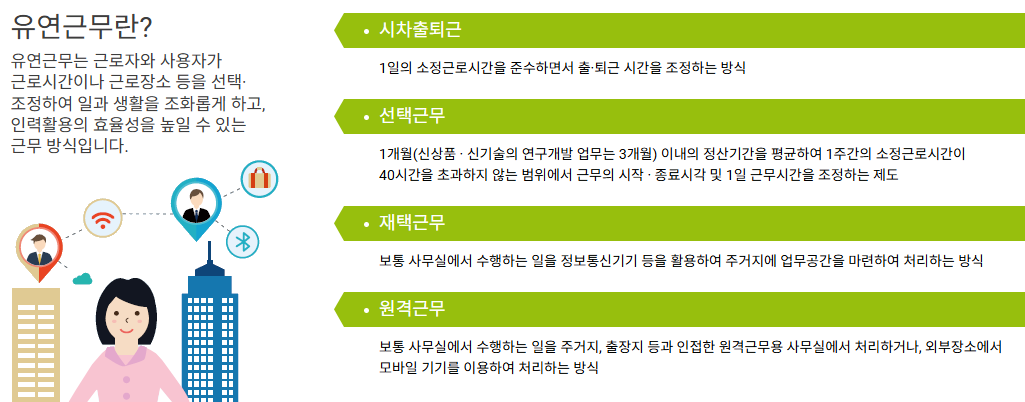 고용노동부가 제공한 매뉴얼에서는 시차출근제, 선택근무제, 재택근무, 근로시간 단축제 등 4가지 유연근무 제도를 소개하고 있습니다.