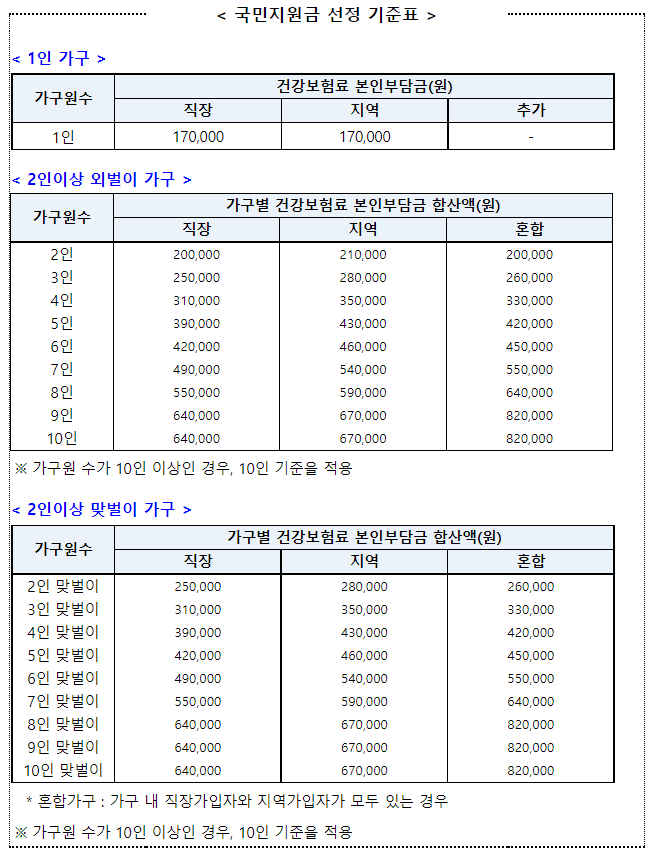 * 맞벌이 가구 : 가구 내 소득원이 2인 이상인 맞벌이 가구는 가구원 수를 1명 추가한 선정기준표를 적용*(예시: 2인 맞벌이 가구 → 3인가구와 동일한 건보료 기준액 적용) 하되, 지역가입자는 ’20년 종합소득이 300만원 이상인 경우에 소득원으로 본다.