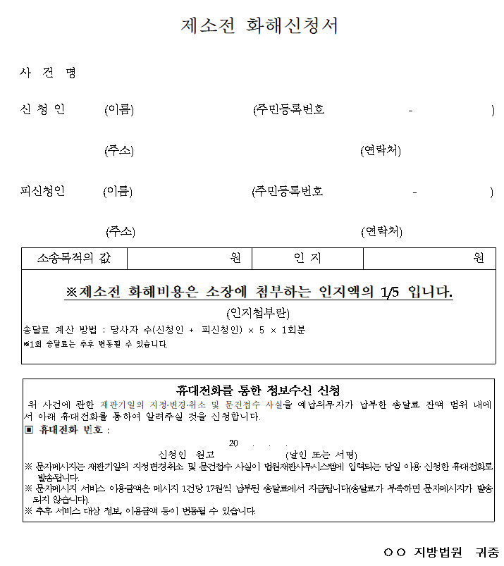 1) 제소전화해 신청서 제출 (신청서는 유첨 화일 참조)
