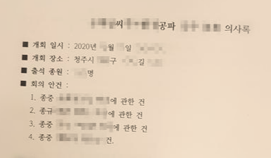 우선 총회 준비를 위한 회의록 의사록 작성시 가장 중요한 안건부터 정리 하여 드렸습니다.
