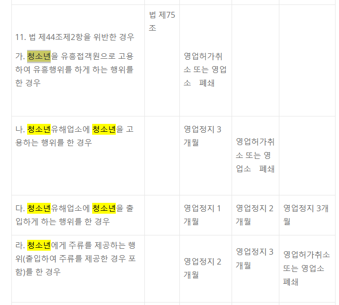 라. 제11호나목(청소년유해업소에 청소년 고용행위)·다목(청소년유해업소에 청소년 출입행위) 또는 라목(청소년에 주류를 제공한 행위)에 해당하는 경우