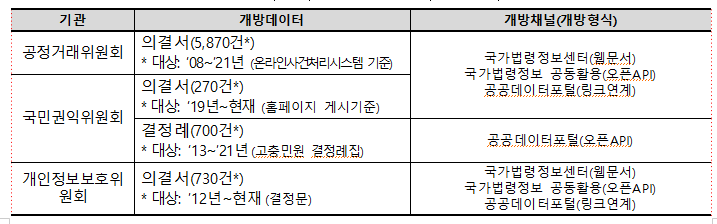 이번에 신규로 공개되는 공공기관은 국민권익위원회, 공정거래위원회, 개인정보보호위원회의 주요 결정문이 공개 대상 정보라고 합니다.