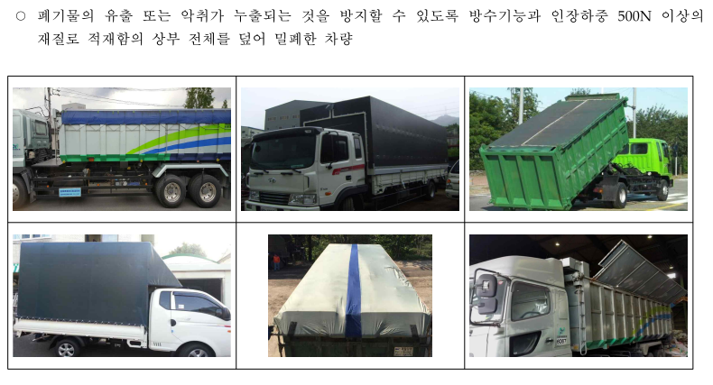 - ※ 적재량이 2톤 미만인 경우에는 폐기물이 흩날리거나 유출되지 아니하도록 적재함에 합성수지 등으로 제작된 포장으로 덮개를 설치한 적재능력 2톤 미만의 차량으로 수집·운반할 수 있음