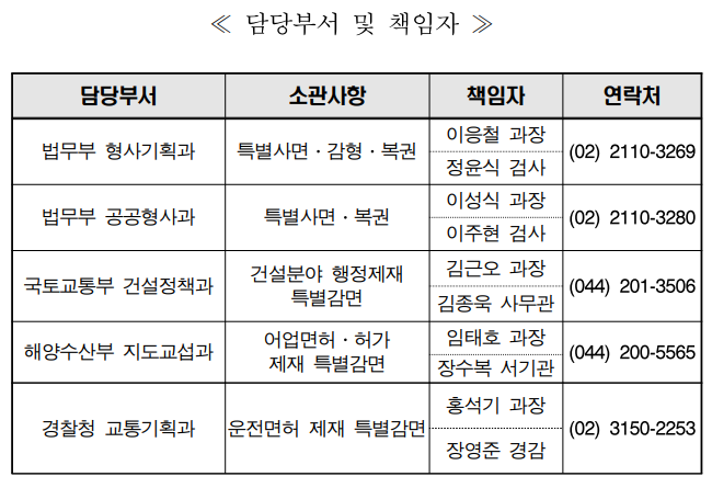 - 아울러, 건설업면허 관련 정지 처분 및 입찰제한, 서민들의 사회 활동에 필수적인 운전면허 취소․정지․벌점, 생계형 어업인의 어업면허 취소․정지 등 행정제재 대상자 총 983,051명에 대한 특별감면 조치를 함께 시행