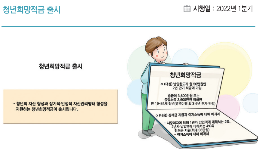 • 청년희망적금 출시 : •(지원 대상) 납입 한도가 월 50만원인 2년 만기 적금에 가입한 총급여3,600만원 또는 종합소득 2,600만원 이하인 만 19~34세 청년(병역이행기간 최대 6년 추가 인정) • (지원 내용) 장려금 지급과 이자소득에 대해 비과세 - 시중 이자에 더해 1년차 납입액에 대해서는 2%, 2년차 납입액에 대해서는 4%의 장려금 지원(최대 36만원) - 이자소득에 대해 비과세 • 시행일 2022년 1분기