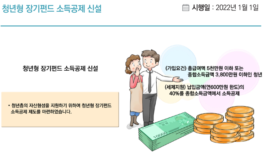 • 청년형 장기펀드 소득공제 신설 : 청년이 장기펀드에 가입 시 납입금액(연 600만원 한도)의 40%를 종합소득금액에서 소득공제합니다 (2022년 1월 1일부터 2023년 12월 31일까지 장기펀드에 가입하는 경우에 적용)