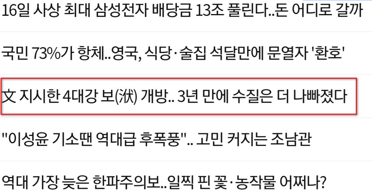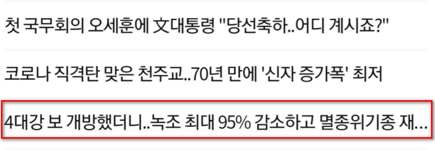 문대통령이 지시한 4대강 보 개방과 관련 수질이 좋아지고 멸종위기종이 다시 온다는 보도와 수질이 더 나빠졌다는 내용의 보도가 같은날 같은 시간대에 동시에 정반대의 글이 올라와 글로 포스팅 해 봅니다.