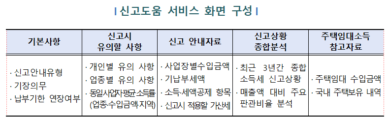 □(안내자료 제공) 국세청은 빅데이터 분석을 통해 성실신고에 도움이 되는 납세자별 맞춤 정보를 홈택스·손택스「신고도움 서비스*」에서 제공합니다.